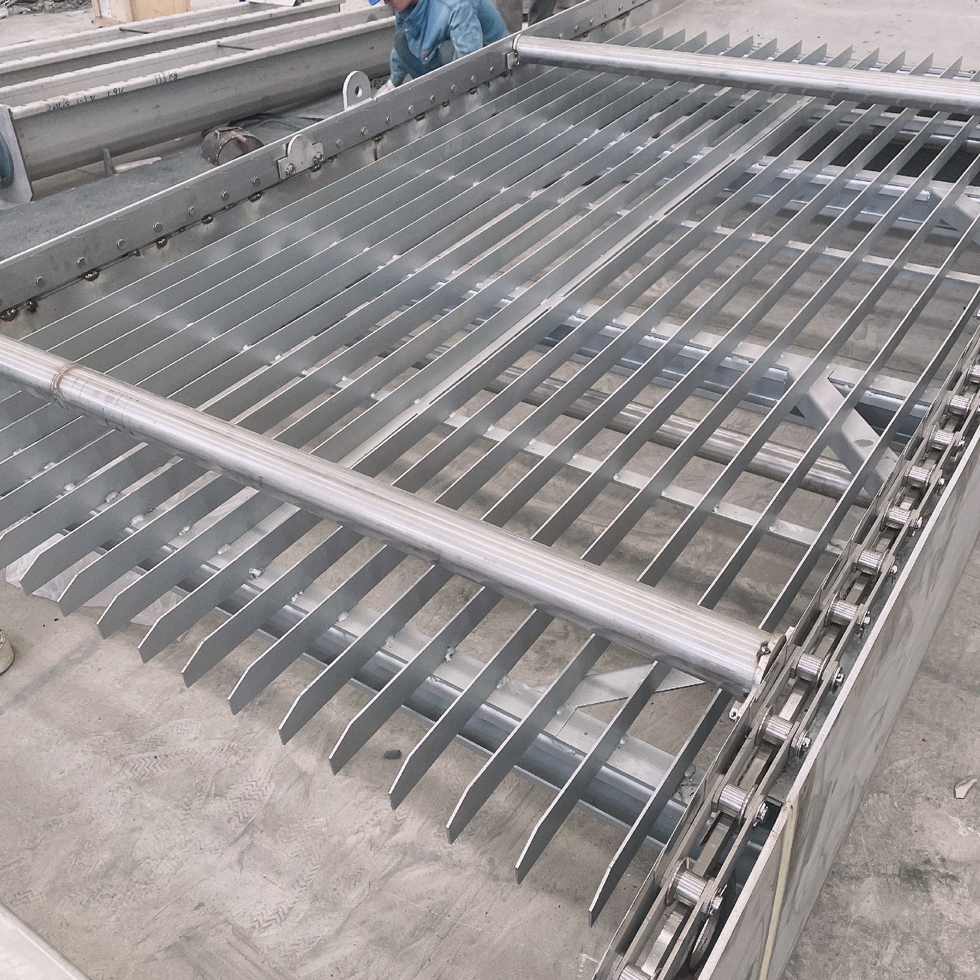 该设备采用背降式、回转链式,由耙齿板和固定栅条组成过水栅面,当污水流过时,大于栅隙的杂物被拦截,耙齿板的耙齿深入栅条的间隙中,当驱动装置带动牵引链作回转运动时,耙齿把截留在栅面上的杂物自下而上带至出渣口,当耙齿自下而上转向运动时,杂物依靠重力自行脱落,从卸料口中落入输送机内,然后外运或作进一步的处理。