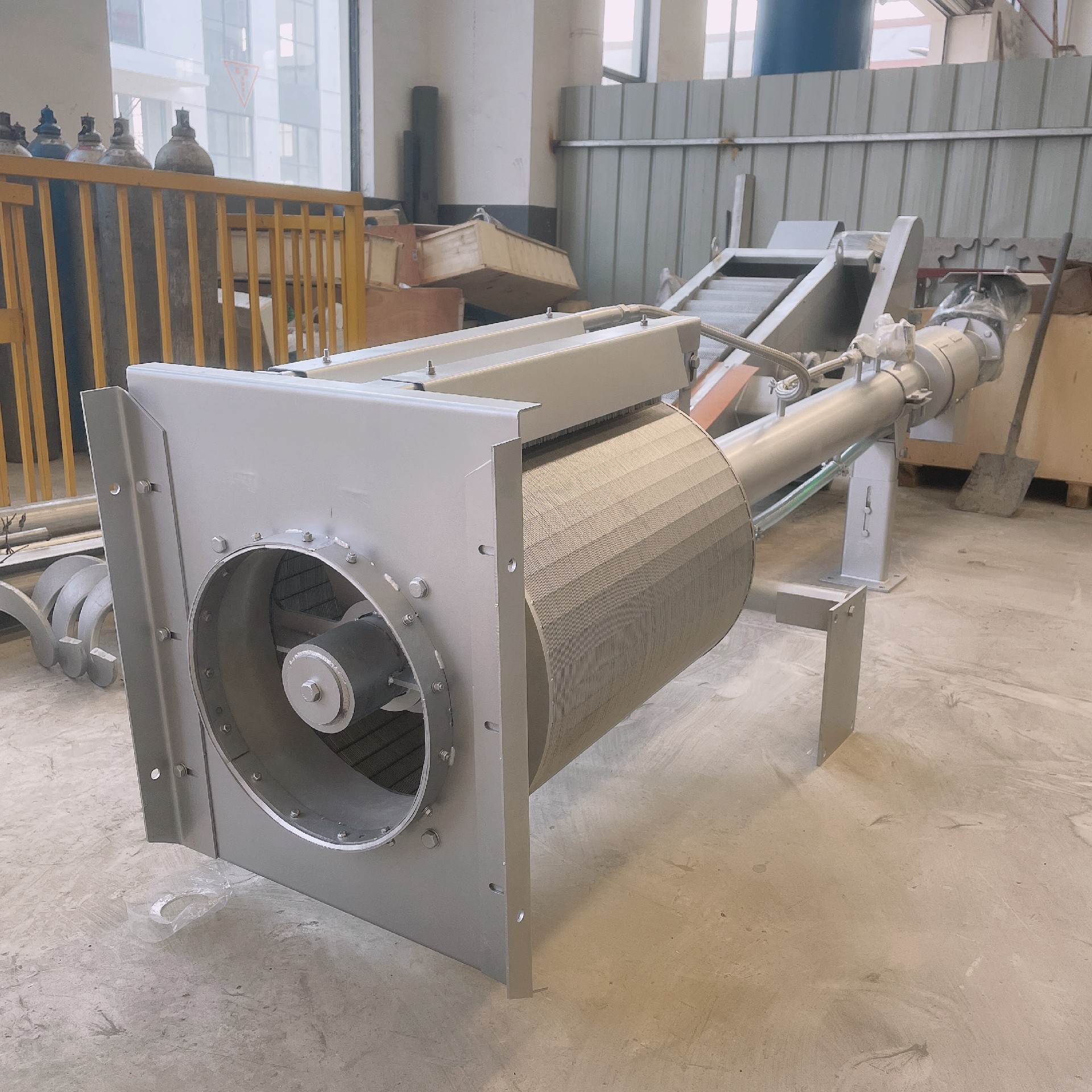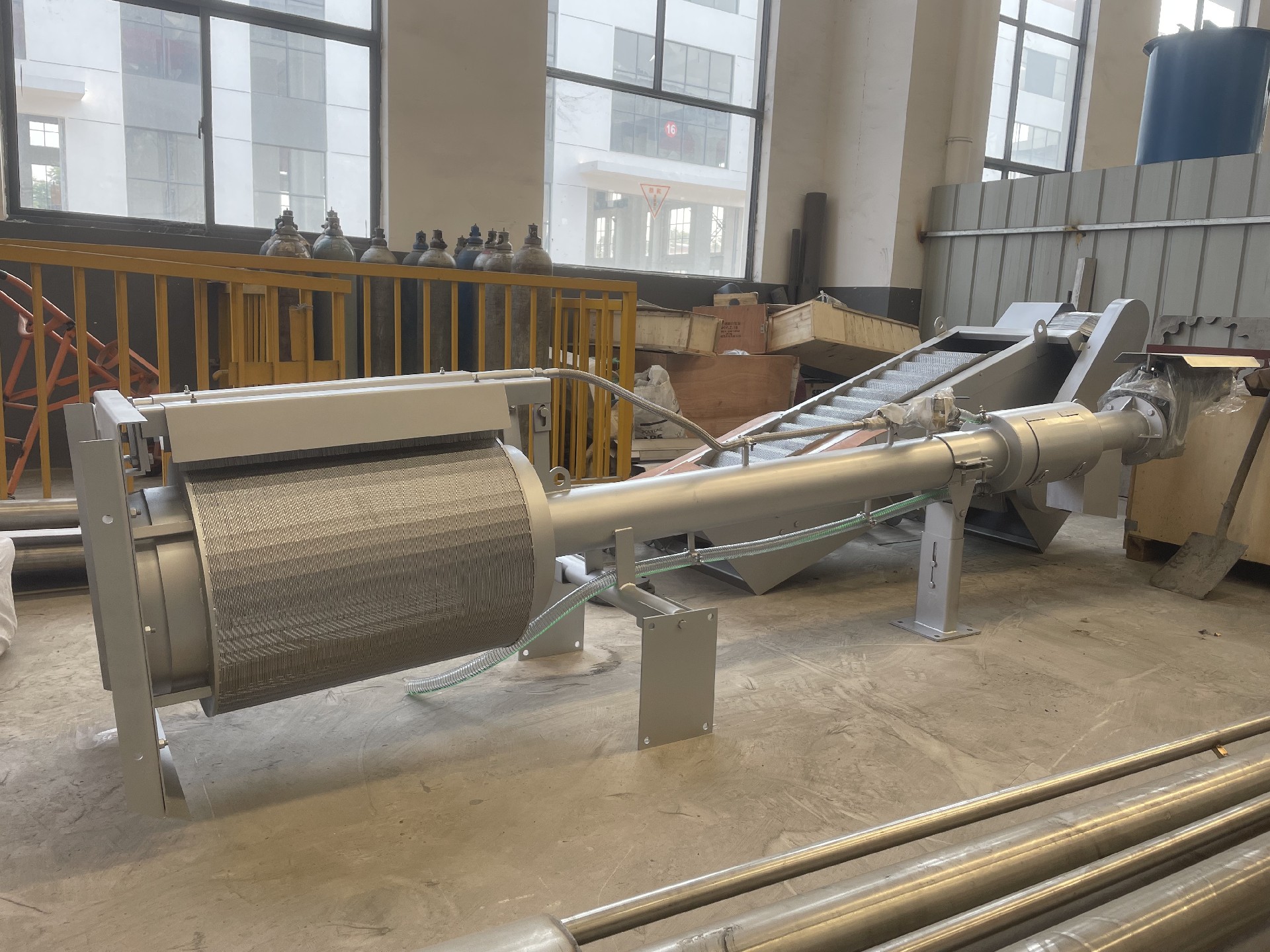 该设备与水平面成35°角安装在水渠中,污水从转鼓的端头流入鼓中,通过转鼓侧面的栅缝流出,格栅将水中的悬浮物、漂流物等留在转鼓中,转鼓以4.6r/min的速度旋转,鼓的上方有尼龙刷和冲洗水喷嘴,将栅渣清除并通过螺旋输送运转挤干,脱水,运至上端排料斗,经输送带运走。