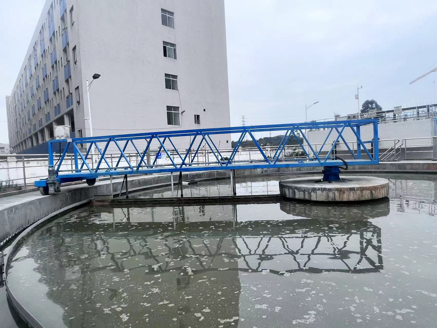 该设备采用中心传动、垂架式,污水从进水管流入导流筒扩散后,均匀的向周边呈辐射状流出,呈悬浮状的污泥经沉淀后沉积于池底,驱动装置带动中心竖架旋转,并带动刮臂及刮泥板转动,将污泥从池周刮向中心集泥槽后,靠池内静水压由排泥管排出池外。水面的浮渣通过撇渣装置撇向池边,再由刮渣耙刮进排渣斗内排出池外。而上清液则通过出水堰板溢入出水槽内排出。