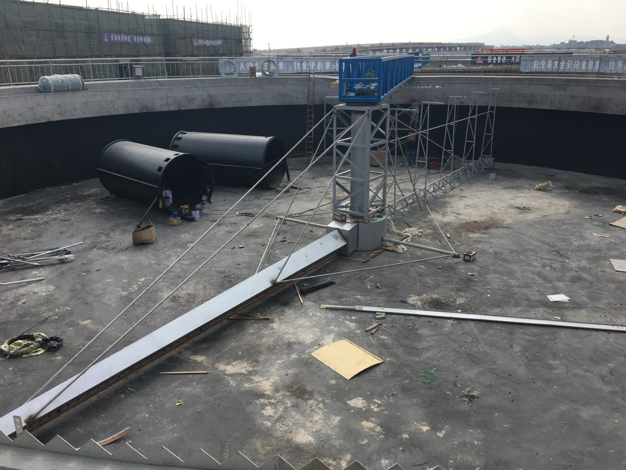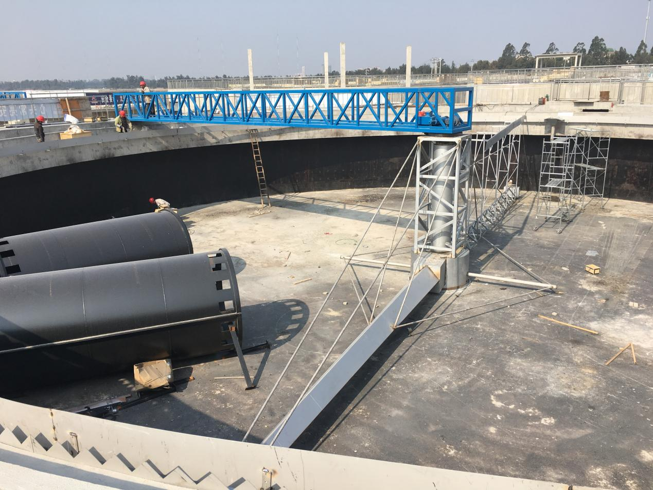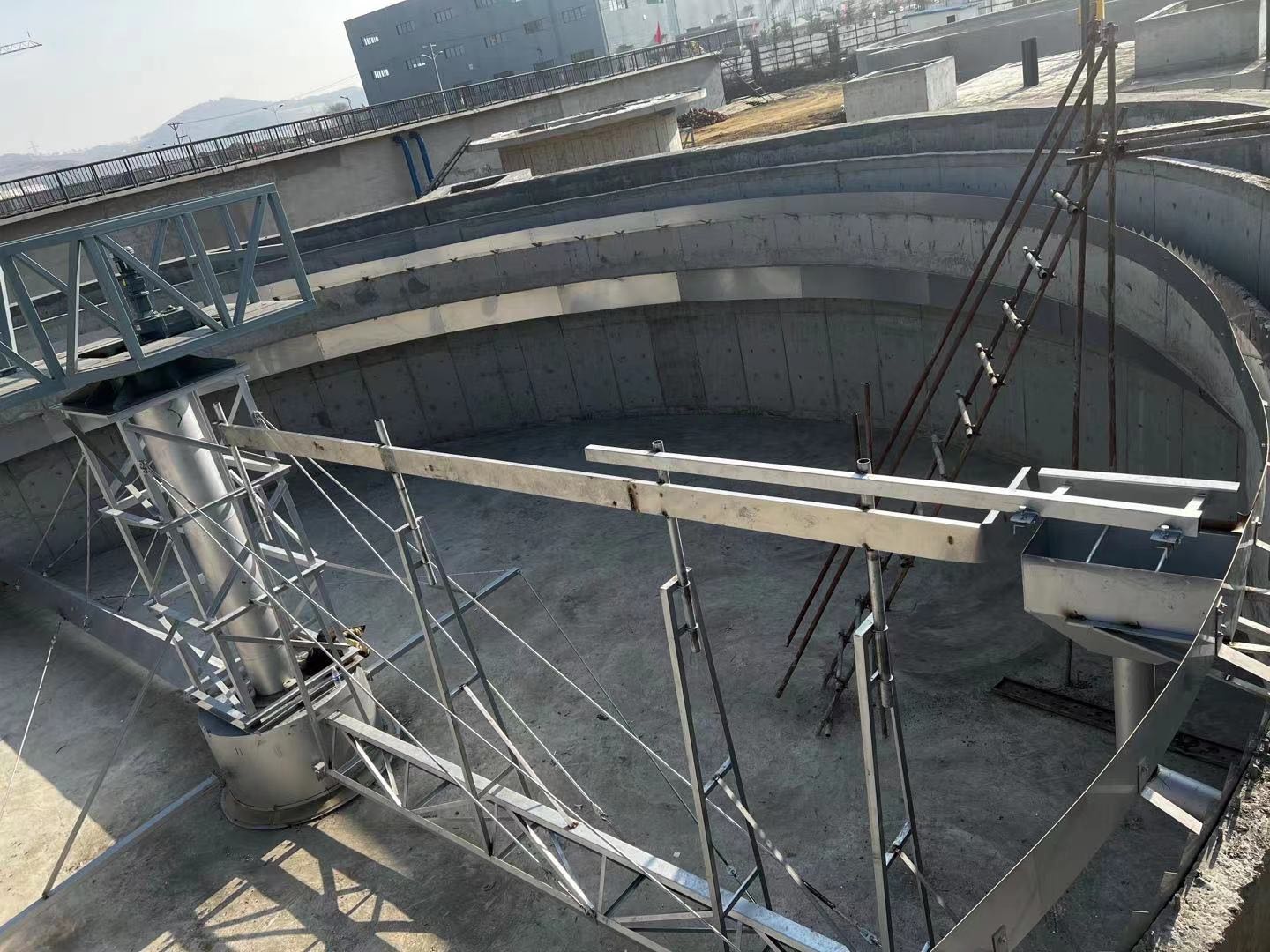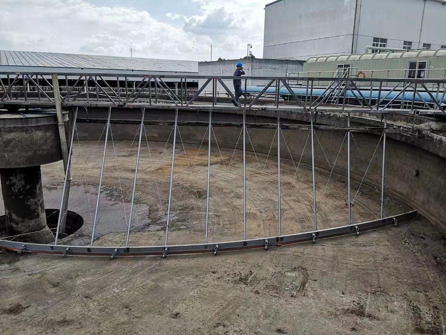 该设备采用中心传动、垂架式,污水进入周边配水槽内,经槽底配水孔均匀流入池内,并在周边挡水裙板的作用下,水流从池底流向中心,污泥依靠自重沉积于池底,从而形成泥水分离,驱动装置驱动中心竖架旋转,并带动刮臂及吸泥管旋转,在静水压力的作用下,污泥均匀地进入吸管上布置的吸口,然后通过中心排泥井的套筒阀排出池外。排泥量的大小可由套筒阀的升降度来控制,水面的浮渣通过撇清装置撇向池边,再由刮渣耙刮进排渣斗内排出池外。