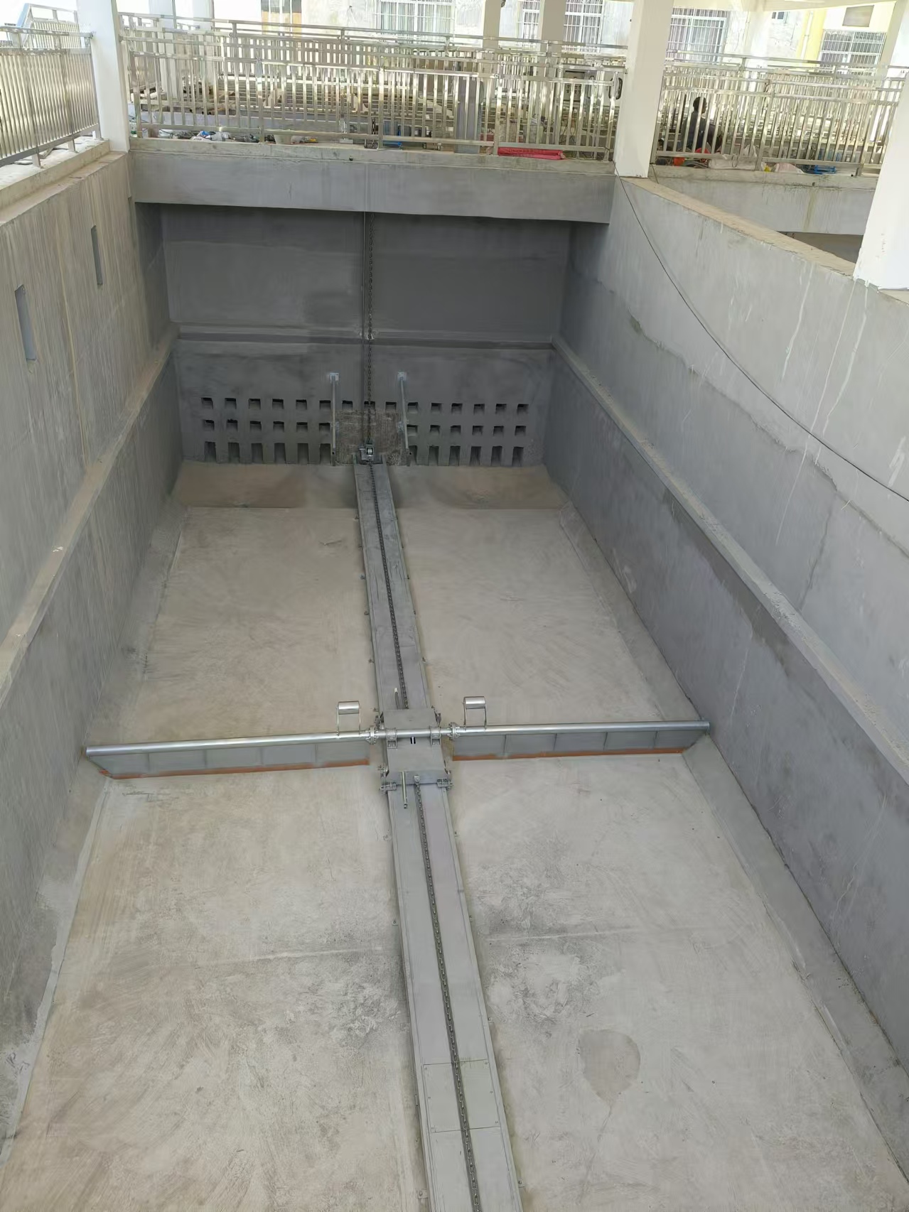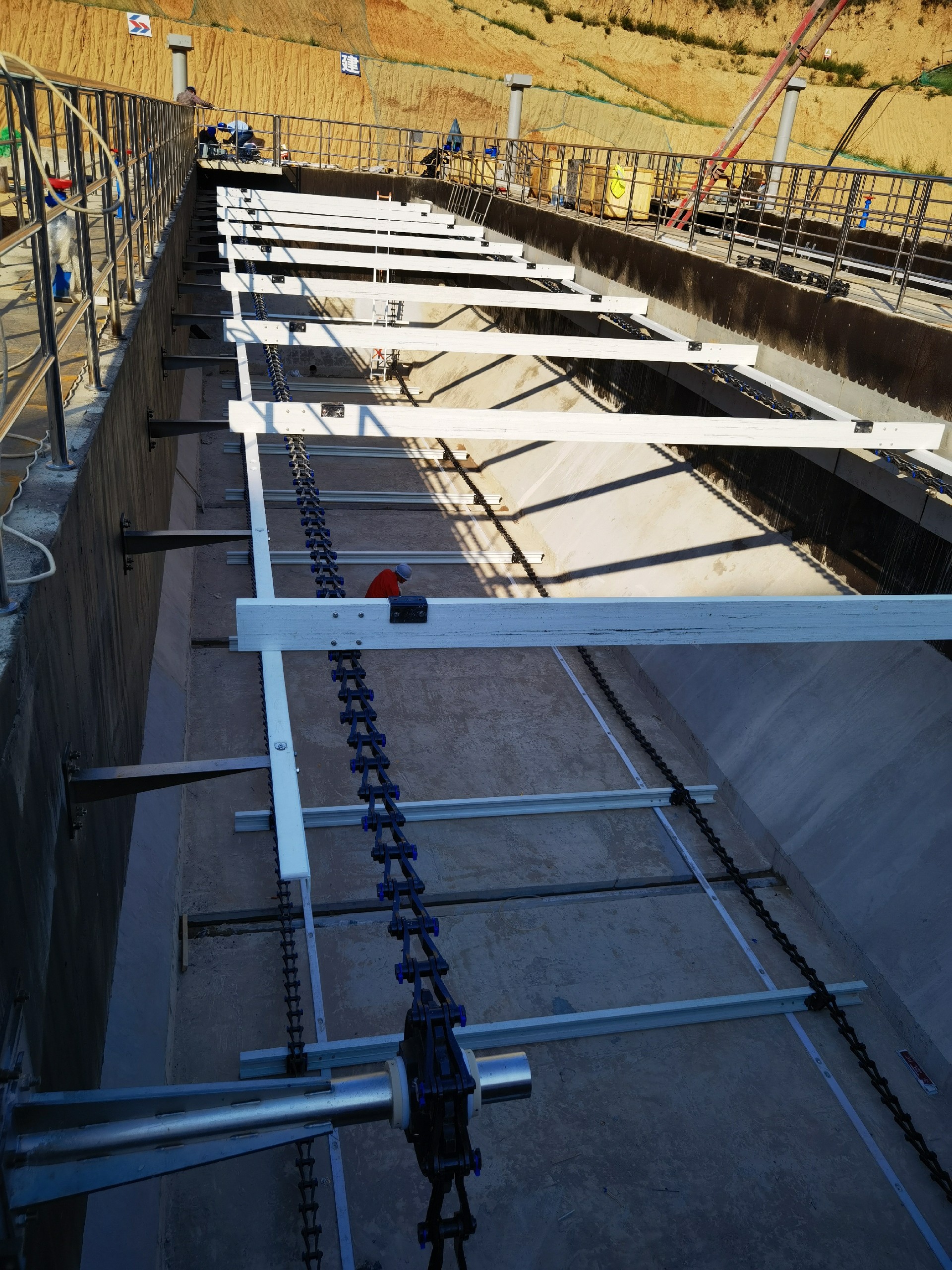 链板式刮泥机由减速机传动输送链条及刮板在池内作循环运行,将池底部泥渣刮进集泥坑。